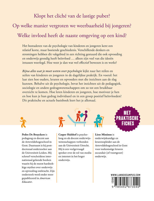 Klopt het cliché van de lastige puber? Op welke manier vergroten we weerbaarheid bij jongeren? Welke invloed heeft de naaste omgeving op een kind? Het bestuderen van de psychologie van kinderen en jongeren kent een relatief korte, maar boeiende geschiedenis. Verschillende denkers en stromingen hebben dit vakgebied in een richting gestuurd die ook opvoeding en onderwijs grondig heeft beïnvloed ... alleen zijn veel van die ideeën intussen weerlegd. Hoe weet je dan wat wel effectief bewezen is en werkt? Bijna alles wat je moet weten over psychologie kijkt naar het reilen en zeilen van kinderen en jongeren in de dagelijkse praktijk. En vooral: het laat zien hoe ouders, leraren en opvoeders met die inzichten aan de slag kunnen. Behalve uit de psychologie, bevat het inzichten uit de pedagogiek, sociologie en andere gedragswetenschappen om zo tot een bruikbaar overzicht te komen. Hoe leren kinderen en jongeren, hoe motiveer je hen en hoe kun je hun gedrag individueel en in een groep positief beïnvloeden? Dit praktische en actuele basisboek leert het je allemaal.