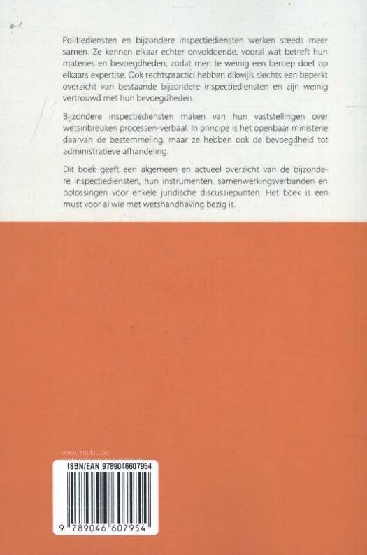 Politiediensten en bijzondere inspectiediensten werken steeds meer samen. Ze kennen elkaar echter onvoldoende, vooral wat betreft hun materies en bevoegdheden, zodat men te weinig een beroep doet op elkaars expertise. Ook rechtspractici hebben dikwijls slechts een beperkt overzicht van bestaande bijzondere inspectiediensten en zijn weinig vertrouwd met hun bevoegdheden. Bijzondere inspectiediensten maken van hun vaststellingen over wetsinbreuken processen-verbaal. In principe is het openbaar ministerie daarvan de bestemmeling, maar ze hebben ook de bevoegdheid tot administratieve afhandeling. Dit boek geeft een algemeen en actueel overzicht van de bijzondere inspectiediensten, hun instrumenten, samenwerkingsverbanden en oplossingen voor enkele juridische discussiepunten. Het boek is een must voor al wie met wetshandhaving bezig is.