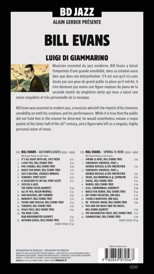 La biographie de Bill Evans, écrite par Alain Gerber, illustrée par Luigi di Giammarino, accompagnée de 2 compacts discs. Musicien essentiel du jazz moderne, Bill Evans a laissé l’empreinte d’une grande sensibilité, dans sa création aussi bien que dans son interprétation. S’il est vrai qu’il n’a sans doute pas aux yeux du grand public la place qu’il mérite, il n’en demeure pas moins une figure majeure du piano de la seconde moitié du vingtième siècle qui nous a laissé une vision singulière et très personnelle de la musique.<br /><br /> Bill Evans was essential to modern jazz, a musician who left the imprint of his immense sensibility on both his creations and his performances. While it is true that the public did not hold him in the esteem he deserved, he would nonetheless remain a major pianist of the latter half of the 20th century, and a figure who left us a singular, highly personal vision of music.<br />