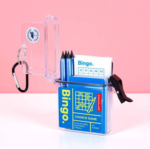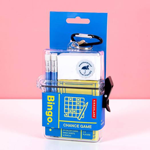 Neem dit klassieke kansspel mee voor onderweg! Inclusief 59 kaarten, 50 bingokaarten, 4 potloden met een lange levensduur en instructies - alles verpakt in een weerbestendige hoes met karabijnhaak voor sleutelhangers om aan elke tas of riem te bevestigen. Ideaal voor op reis, kamperen en buitenspelen. Behuizing van PC, PET-papier, bamboe, ABS, PS, TPR, ALU, ijzer, grafiet: 3,75 x 4,75 x 1,5.