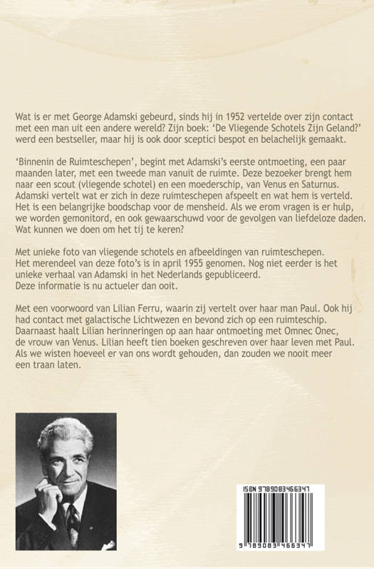 ‘Binnenin de Ruimteschepen’, begint met Adamski’s eerste ontmoeting, een paar maanden later, met een tweede man vanuit de ruimte. Deze bezoeker brengt hem naar een scout (vliegende schotel) en een moederschip, van Venus en Saturnus. Adamski vertelt wat er zich in deze ruimteschepen afspeelt en wat hem is verteld. Het is een belangrijke boodschap voor de mensheid. Als we erom vragen is er hulp, we worden gemonitord, en ook gewaarschuwd voor de gevolgen van liefdeloze daden. Wat kunnen we doen om het tij te keren?