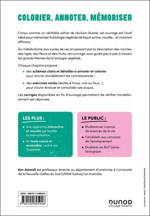 Ce cahier de révision propose une approche structurée pour comprendre les structures et processus des végétaux. En couvrant les groupes de plantes allant des algues aux gymnospermes, chaque chapitre guide l'étudiant à travers des schémas détaillés à colorier et à légender. Six chapitres thématiques permettent une progression logique : le métabolisme et la reproduction, les cycles de vie, les racines, les tiges, les feuilles, ainsi que les fleurs et les fruits. Plus de 100 illustrations permettent une assimilation active des connaissances, tandis que des textes à trous et quiz en fin de chapitre permettent de contrôler les connaissances acquises. L'ensemble des corrigés sont disponibles à la fin de l'ouvrage.