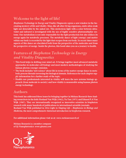This book has addressed these issues by bringing together in Meluna Research three leading researchers in the field: Roeland Van Wijk (1942), Yu Yan (1971) and Eduard P.A Van Wijk (1967). They are internationally recognized as innovative scientists in biophoton research with many hundreds of publications in international scientific journals.