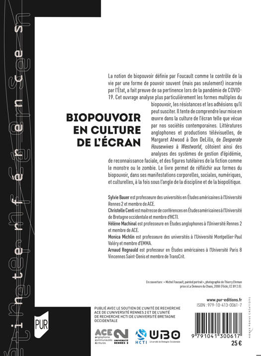 La notion de biopouvoir défi nie par Foucault comme le contrôle de la vie par une forme de pouvoir souvent (mais pas seulement) incarnée par l’État, a fait preuve de sa pertinence lors de la pandémie de COVID-19. Cet ouvrage analyse plus particulièrement les formes multiples du biopouvoir, les résistances et les adhésions qu’il peut susciter. Il tente de comprendre leur mise en oeuvre dans la culture de l’écran telle que vécue par nos sociétés contemporaines. Littératures anglophones et productions télévisuelles, de Margaret Atwood à Don DeLillo, de Desperate Housewives à Westworld, côtoient ainsi des analyses des systèmes de gestion d’épidémie, de reconnaissance faciale, et des figures tutélaires de la fiction comme le monstre ou le zombie. Le livre permet de réfléchir aux formes du biopouvoir, dans ses manifestations corporelles, sociales, numériques, et culturelles, à la fois sous l’angle de la discipline et de la biopolitique.