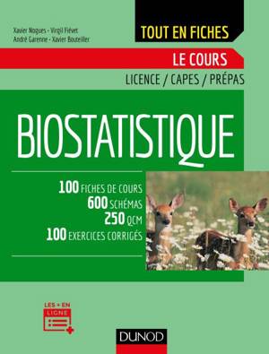 Cet ouvrage fait la synthèse en 100 fiches des principaux concepts, outils et méthodes de biostatistique enseignés de la Licence au Master. A travers des problèmes concrets (exemple : tester l'effet d'un sirop antitussif), chaque fiche guide l'étudiant vers une solution intuitive dont elle présentera la formalisation mathématique. La présentation est adaptée aux besoins des étudiants préparant un examen ou un concours : fiches synthétiques associant un concept fondamental à des exemples, schémas, exercices avec corrections argumentées. Les tableaux de données des exercices sont téléchargeables sur le site dunod.com.