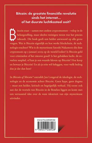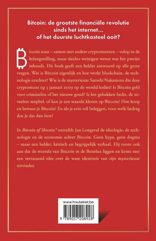 Bitcoin: de grootste financiële revolutie sinds het internet… of het duurste luchtkasteel ooit? Bitcoin staat – samen met andere cryptomunten – volop in de belangstelling, maar slechts weinigen weten wat het precies inhoudt. Dit boek geeft een helder antwoord op alle grote vragen. Wat is Bitcoin eigenlijk en hoe werkt blockchain, de technologie erachter? Wie is de mysterieuze Satoshi Nakamoto die deze cryptomunt op 3 januari 2009 op de wereld losliet? Is Bitcoin geld voor criminelen of het nieuwe goud? Is het gebakken lucht, de zoveelste zeepbel, of kan je een waarde kleven op Bitcoin? Hoe koop en bewaar je Bitcoin? En als je erin wil beleggen, voor welk bedrag doe je dat dan best? In 'Bitcoin of Shtcoin*' ontrafelt Jan Longeval de ideologie, de technologie en de economie achter Bitcoin. Geen hype, geen dogma – maar een helder, kritisch en begrijpelijk verhaal. Hij toont ook aan dat de wortels van Bitcoin in de Benelux liggen en komt met een verrassend idee over de ware identiteit van zijn mysterieuze uitvinder.
