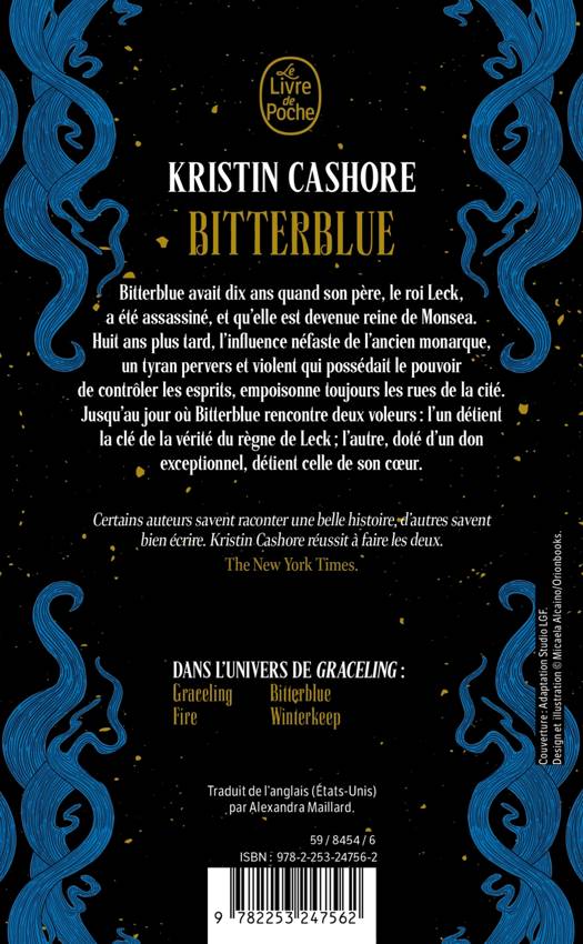 Bitterblue avait dix ans quand son père, le roi Leck, a été assassiné et qu’elle est devenue reine de Monsea. Huit ans plus tard, l’influence néfaste de l’ancien monarque, un tyran pervers et violent qui possédait le pouvoir de contrôler les esprits, empoisonne toujours les rues de la cité. Jusqu’au jour où Bitterblue rencontre deux voleurs : l’un détient la clé sur la vérité du règne de Leck ; l’autre, doté d’un pouvoir exceptionnel, détient celle de son cœur.