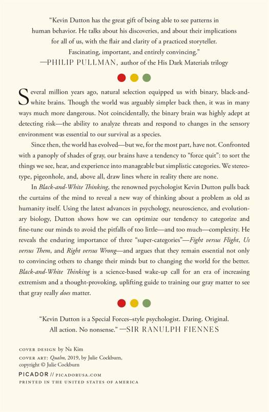 Several million years ago, natural selection equipped us with binary, black-and-white brains. Though the world was arguably simpler back then, it was in many ways much more dangerous. Not coincidentally, the binary brain was highly adept at detecting risk--the ability to analyze threats and respond to changes in the sensory environment was essential to our survival as a species. Since then, the world has evolved--but we, for the most part, have not. Confronted with a panoply of shades of gray, our brains have a tendency to "force quit" to sort the things we see, hear, and experience into manageable but simplistic categories. We stereotype, pigeonhole, and, above all, draw lines where in reality there are none. In Black-and-White Thinking, the renowned psychologist Kevin Dutton pulls back the curtains of the mind to reveal a new way of thinking about a problem as old as humanity itself. While our instinct for categorization often leads us astray, encouraging polarization, rigid thinking, and sometimes outright denialism, it is an essential component of the mental machinery we use to make sense of the world. Using the latest advances in psychology, neuroscience, and evolutionary biology, Dutton shows how we can optimize our tendency to categorize and fine-tune our minds to avoid the pitfalls of too little--and too much--complexity. He reveals the enduring importance of three "super-categories"--Fight versus Flight, Us versus Them, and Right versus Wrong--and argues that they remain essential not only to convincing others to change their minds but to changing the world for the better. Black-and-White Thinking is a science-based wake-up call for an era of increasing extremism and a thought-provoking, uplifting guide to training our gray matter to see that gray really does matter.