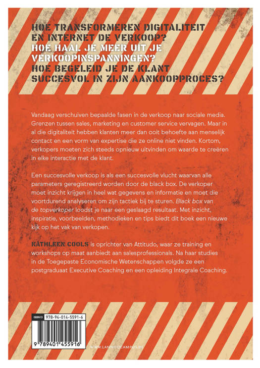 Kathleen Cools ziet een succesvolle verkoop als een succesvolle vlucht. Vele parameters spelen een rol en de verkoper moet ze voortdurend analyseren om zijn tactiek bij te sturen. Black box van de topverkoper bevat alle belangrijke informatie om tot een geslaagd resultaat te komen. Boordevol tips en tricks biedt dit boek een nieuwe kijk op het vak van verkopen.