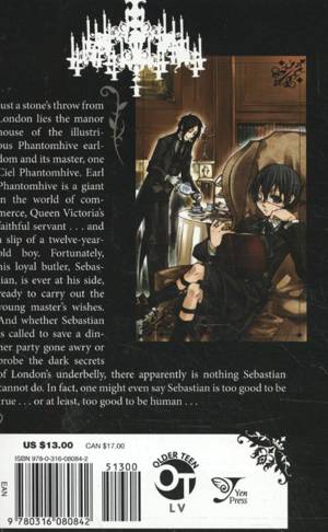 Just a stone's throw from London lies the manor house of the illustrious Phantomhive earldom, its master one Ciel Phantomhive. Earl Phantomhive is a giant in the world of commerce, Queen Victoria's faithful servant . . . and a slip of a twelve-year old boy. Fortunately, his loyal butler, Sebastian, is ever at his side, ready to carry out the young master's wishes. And whether Sebastian is called to save a dinner party gone awry or probe the dark secrets of London's underbelly, there is practically nothing Sebastian cannot do. In fact, one might even say Sebastian is too good to be true . . . or at least, he is too good to be human . . .