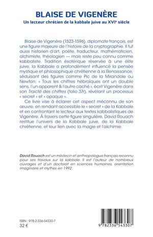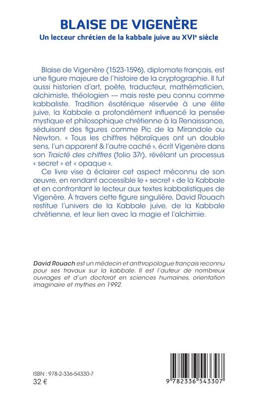 Blaise de Vigenère (1523-1596), diplomate français, est une figure majeure de l'histoire de la cryptographie. Il fut aussi historien d'art, poète, traducteur, mathématicien, alchimiste, théologien - mais reste peu connu comme kabbaliste. Tradition ésotérique réservée à une élite juive, la Kabbale a profondément influencé la pensée mystique et philosophique chrétienne à la Renaissance, séduisant des figures comme Pic de la Mirandole ou Newton. Tous les chiffres hébraïques ont un double sens, l'un apparent & l'autre caché, écrit Vigenère dans son Traicté des chiffres (folio 37r), révélant un processus secret et opaque . Ce livre vise à éclairer cet aspect méconnu de son oeuvre, en rendant accessible le secret de la Kabbale et en confrontant le lecteur aux textes kabbalistiques de Vigenère. À travers cette figure singulière, David Rouach restitue l'univers de la Kabbale juive, de la Kabbale chrétienne, et leur lien avec la magie et l'alchimie.