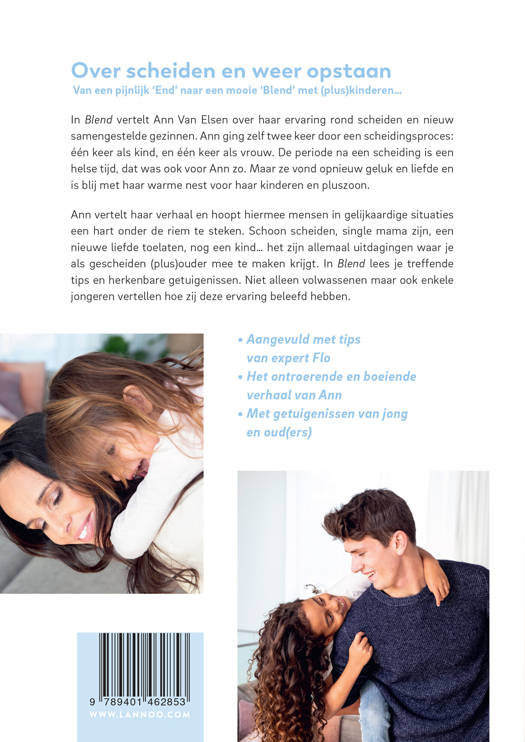 Ann vertelt haar verhaal en hoopt hiermee mensen in gelijkaardige situaties een hart onder de riem te steken. Schoon scheiden, single mama zijn, een nieuwe liefde toelaten, nog een kind... het zijn allemaal uitdagingen waar je als gescheiden (plus)ouder mee te maken krijgt. In Blend lees je treffende tips en herkenbare getuigenissen. Niet alleen volwassenen maar ook enkele jongeren vertellen hoe zij deze ervaring beleefd hebben.