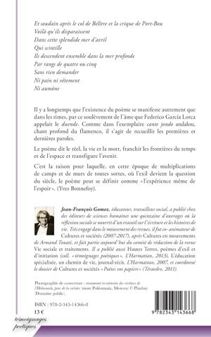 Le poème dit le réel, la vie et la mort, franchit les frontières du temps et de l'espace et transfigure l'avenir. C'est la raison pour laquelle, en cette époque de multiplications de camps et de murs de toutes sortes, où l'exil devient la question du siècle, le poème peut se définir comme "l'expérience même de l'espoir" ( Y. Bonnefoy).