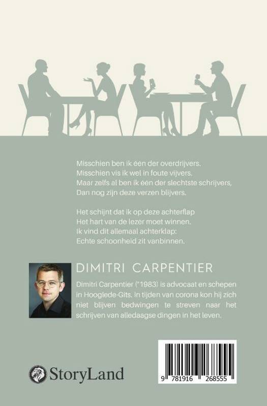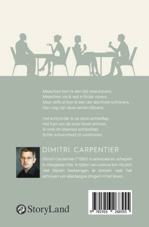 Het schijnt dat ik op deze achterflap Het hart van de lezer moet winnen. Ik vind dit allemaal achterklap: Echte schoonheid zit vanbinnen.Dimitri Carpentier (°1983) is advocaat en schepen in Hooglede-Gits. In tijden van corona kon hij zich niet blijven bedwingen te streven naar het schrijven van alledaagse dingen in het leven.