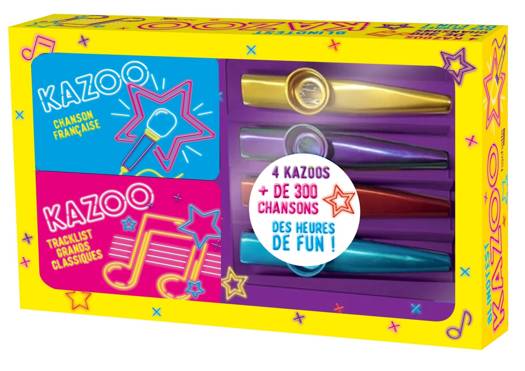 - 4 kazoos colorés en métal - 1 livret détaillant les règles du jeu - 120 cartes et 4 catégories : autour du monde, chanson française, bandes originales, grands classiques…