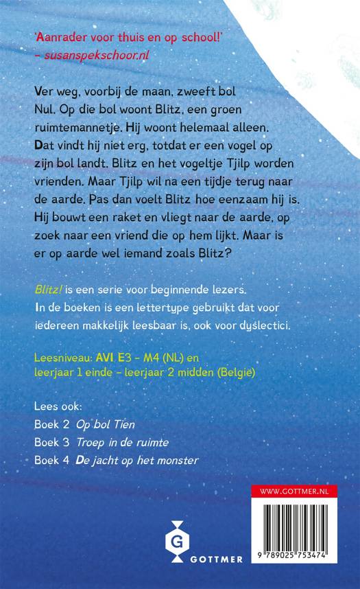Ver weg, voorbij de maan, zweeft bol Nul. Op die bol woont Blitz, een groen ruimtemannetje. Hij woont helemaal alleen. Dat vindt hij niet erg, totdat er een vogel op zijn bol landt. Blitz en het vogeltje Tjilp worden vrienden. Maar Tjilp wil na een tijdje terug naar de aarde. Pas dan voelt Blitz hoe eenzaam hij is. Hij bouwt een raket en vliegt naar de aarde, op zoek naar een vriend die op hem lijkt. Maar is er op aarde wel iemand zoals Blitz?