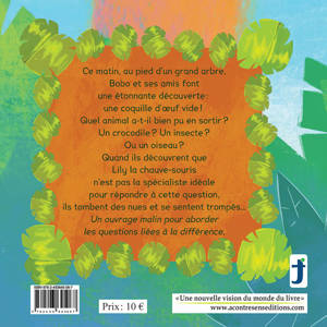 Résumé : Ce matin, au pied d’un grand arbre, Bobo et ses amis font une étonnante découverte : une coquille d’œuf vide ! Quel animal a-t-il bien pu en sortir ? Un crocodile ? Un insecte ? Ou un oiseau ? Quand ils découvrent que Lily la chauve-souris n’est pas la spécialiste idéale pour répondre à cette question, ils tombent des nues et se sentent trompés… Un ouvrage malin pour aborder les questions liées à la différence.