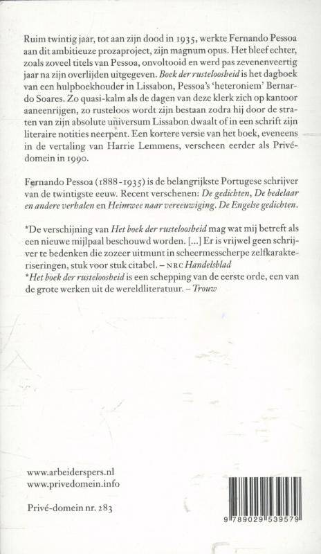 Ruim twintig jaar, tot aan zijn dood in 1935, werkte Pessoa aan dit ambitieuze prozaproject. Het bleef echter, zoals zoveel titels van Pessoa, onvoltooid en werd pas zevenenveertig jaar na zijn overlijden uitgegeven. Het boek der rusteloosheid is het dagboek van een hulpboekhouder in Lissabon, Pessoa’s ‘heteroniem’ Bernardo Soares. Zo quasi-kalm als de dagen van deze klerk zich op kantoor aaneenrijgen, zo rusteloos wordt zijn bestaan zodra hij door de straten van zijn absolute universum Lissabon dwaalt of in een schrift zijn literaire notities neerpent. Een kortere versie van het boek verscheen eerder als Privé-domein in 1990.