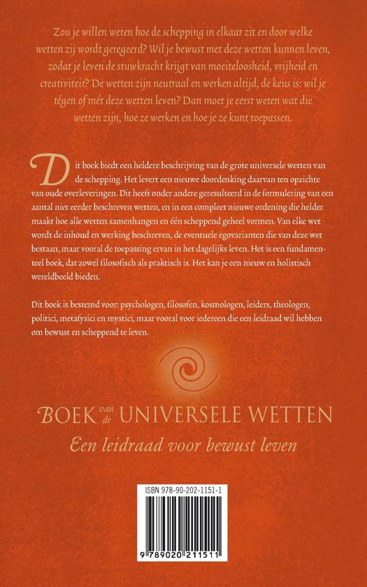 Dit boek levert met zijn heldere beschrijving van de grote universele wetten van de schepping een nieuwe doordenking op ten opzichte van oude overleveringen. Dit heeft onder andere geresulteerd in de formulering van een aantal niet eerder beschreven wetten, en in een compleet nieuwe ordening die helder maakt hoe alle wetten samenhangen en één scheppend geheel vormen. Van elke wet wordt de inhoud en werking beschreven, de eventuele egovarianten die van deze wet bestaan, maar vooral de toepassing ervan in het dagelijks leven. Het is een fundamenteel boek, dat zowel filosofisch als praktisch is. Het kan je een nieuw en holistisch wereldbeeld bieden.