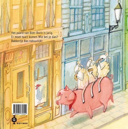 In 'Boer Boris en bakkertje Bas' is Knol jarig - en dat moet gevierd worden! Boer Boris kan veel zelf, maar een taart bakken, dat laat hij liever aan de echte bakker over. Bakkertje Bas bakt een prachtige paardentaart voor Knol en komt hem zelfs bezorgen. Maar dan krijgt bakkertje Bas pech onderweg en belandt hij met bestelbus en al in de sloot. Gelukkig kan Boer Boris daarbij helpen! Hij takelt de bakker uit de sloot, en dan kan het verjaardagsfeest eindelijk beginnen. Voor lezers vanaf 3 jaar.