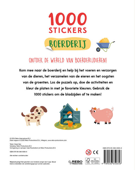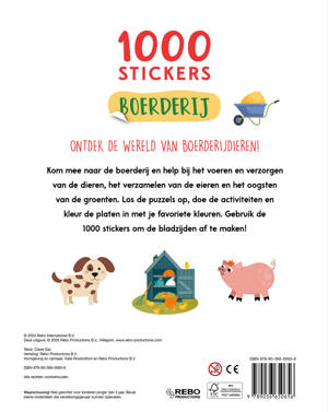 Kom mee naar de boerderij en help bij het voeren en verzorgen van de dieren, het verzamelen van de eieren en het oogsten van de groenten. Los de puzzels op, doe de activiteiten en kleur de platen in met je favoriete kleuren. Gebruik de 1000 stickers om de bladzijden af te maken!