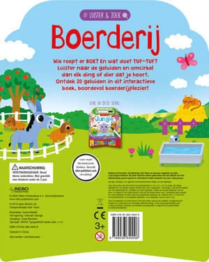 Wie roept er BOE? En wat doet TUF-TUF? Luister naar de geluiden en omcirkel dan elk ding of dier dat je hoort. Ontdek 20 geluiden in dit interactieve boek, boordevol boerderijplezier!