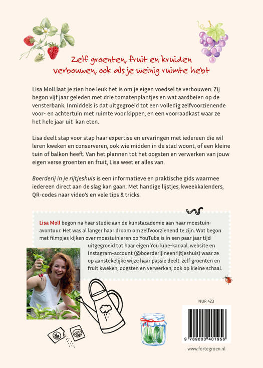 Boerderij in je rijtjeshuis is een informatieve en praktische gids waarmee iedereen aan de slag kan gaan. Met handige lijstjes, kweekkalenders, QR-codes naar video’s en vele tips & tricks.