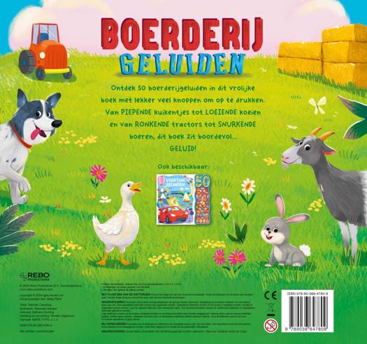 Ontdek 50 boerderijgeluiden in dit vrolijke boek met lekker veel knoppen om op te drukken. Van piepende kuikentjes tot loeiende koeien en van ronkende tractors tot snurkende boeren, dit boek zit boordevol… geluid!