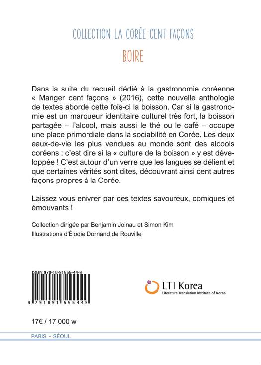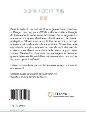 Dans la suite du recueil dédié à la gastronomie coréenne "Manger cent façons" (2016), cette nouvelle anthologie de textes aborde cette fois-ci le boire. Car si la gastronomie est un marqueur identitaire culturel très fort, la boisson partagée - l'alcool, mais aussi le thé ou le café - occupe une place primordiale dans la sociabilité en Corée. Les deux liqueurs les plus vendues au monde sont des acools coréens : c'est pour dire si la "culture de l'alcool" y est développée ! C'est autour d'un verre que les langues se délient et que certaines vérités sont dites, découvrant ainsi cent autres façons de la Corée. Laissez vous enivrer par ces textes savoureux, comiques et pathétiques !