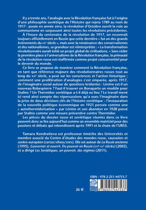 Il y a trente ans, l'analogie avec la Revolution francaise fut a l'origine d'une philosophie sovietique de l'Histoire qui rejeta 1789 au nom de 1917: posee en annee zero, la revolution d'Octobre ouvrit la voie au communisme en surpassant ainsi toutes les revolutions precedentes. A l'heure du centenaire de la revolution de 1917, on reconnait toujours officiellement en Russie que cette derniere fut un des grands evenements du XXe siecle, mais avec la renaissance des conservatismes et des nationalismes, sa grandeur est reinterpretee: La transformation revolutionnaire aurait initie un projet global de civilisations. Sans ceder la premiere place a l'universalisme de la Revolution francaise, la primaute de la revolution russe est reaffirmee comme projet concurrentiel pour le devenir du monde. Ce livre se propose de montrer comment la Revolution francaise, en tant que reference majeure des revolutionnaires russes tout au long du XIXe siecle, a pese sur les consciences et l'action historique; comment une proliferation d'analogies s'est emparee, apres 1917, de l'imaginaire social autour de questions brulantes: Lenine est-il un nouveau Robespierre ? Faut-il trouver en Bonaparte un modele pour Staline ? Un Thermidor sovietique a-t-il deja eu lieu ? Le travail mene ici rend ainsi compte des repercussions qu'a eues l'imaginaire dans la prise de deux decisions cles de l'histoire sovietique - l'instauration de la nouvelle politique economique en 1921 pensee comme une autothermidorisation par Lenine et son abandon en 1928 pense par Staline comme une mesure preventive contre Thermidor. Les pieces du dossier russe et sovietique reunies dans ce livre peuvent donc se lire aujourd'hui comme un ensemble matriciel pour des passions et debats qui rebondissent apres 1991 et la chute de l'URSS.