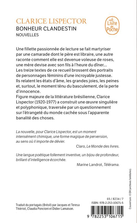 Une fillette passionnée de lecture se fait martyriser par une camarade dont le père est libraire, une autre raconte comment elle est devenue voleuse de roses, une mère devise avec son fils à l’heure du dîner… Clarice Lispector dresse dans ces treize textes des portraits de personnages féminins d’une incroyable justesse. Elle relate les états d’âme, les grandes joies, les peines et, surtout, le moment ténu du basculement, de la perte d’innocence.