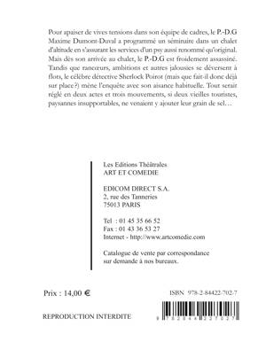 Pour apaiser de vives tensions dans son équipe de cadres, le P.-D.G Maxime Dumont-Duval a programmé un séminaire dans un chalet d'altitude en s'assurant les services d'un psy aussi renommé qu'original. Mais dès son arrivée au chalet, le P.-D.G est froidement assassiné. Tandis que rancoeurs, ambitions et autres jalousies se déversent à flots, le célèbre détective Sherlock Poirot (mais que fait-il donc déjà sur place ?) mène l'enquête avec son aisance habituelle. Tout serait réglé en deux actes et trois mouvements, si deux vieilles touristes, paysannes insupportables, ne venaient y ajouter leur grain de sel...