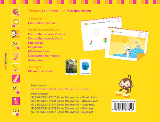 Thèmes : Les fleurs - La fête des mères. 1 histoire : Bonne fête maman. 16 fiches détachables : Compréhension de l'histoire. Compréhension de l'oral. Phonologie. Graphisme. Mathématiques. Découverte du monde. Autonomie. 1 imagier. 20 mots illustrés
