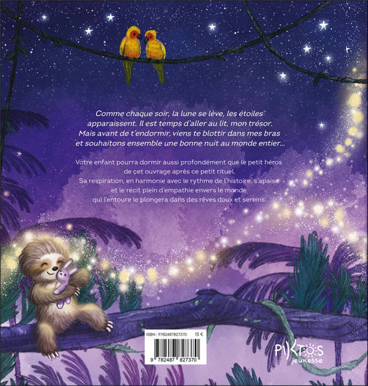 Comme chaque soir, la lune se lève, les étoiles apparaissent. Il est temps d’aller au lit, mon trésor. Mais avant de t’endormir, viens te blottir dans mes bras et souhaitons ensemble une bonne nuit au monde entier… Votre enfant pourra dormir aussi profondément que le petit héros de cet ouvrage après ce petit rituel. Sa respiration, en harmonie avec le rythme de l’histoire, s’apaise et le récit plein d’empathie envers le monde qui l’entoure le plongera dans des rêves doux et sereins.