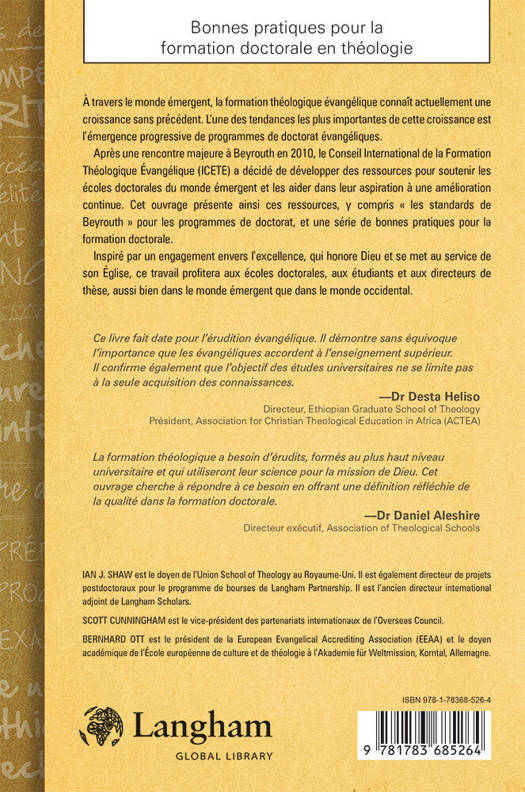 Après une rencontre majeure à Beyrouth en 2010, le Conseil International de la Formation Théologique Évangélique (ICETE) a décidé de développer des ressources pour soutenir les écoles doctorales du monde émergent et les aider dans leur aspiration à une amélioration continue. Cet ouvrage présente ainsi ces ressources, y compris « les standards de Beyrouth » pour les programmes de doctorat, et une série de bonnes pratiques pour la formation doctorale.
