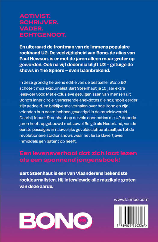 In deze grondig herziene editie van de bestseller Bono 50 schotelt muziekjournalist Bart Steenhaut je 15 jaar extra leesvoer voor. Met exclusieve getuigenissen van mensen uit Bono's inner circle, verrassende anekdotes die nog nooit eerder zijn gedeeld, en beklijvende verhalen over hoe Bono en zijn vrienden hun naam hebben gevestigd in de muziekwereld. Daarbij focust Steenhaut op de vele connecties die U2 door de jaren heeft opgebouwd met zowel België als Nederland, van de eerste passages in nauwelijks gevulde achterafzaaltjes tot de revolutionaire stadionshows waar het Ierse klavertjevier inmiddels een patent op heeft.