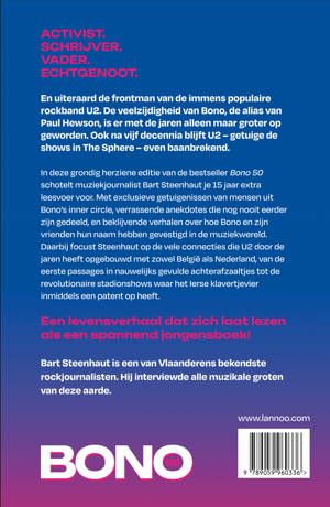 Activist. Schrijver. Vader. Echtgenoot. En uiteraard de frontman van de immens populaire rockband U2. De veelzijdigheid van Bono, de alias van Paul Hewson, is er met de jaren alleen maar groter op geworden. Ook na vijf decennia blijft U2 - getuige de shows in The Sphere - even baanbrekend. In deze grondig herziene editie van de bestseller Bono 50 schotelt muziekjournalist Bart Steenhaut je 15 jaar extra leesvoer voor. Met exclusieve getuigenissen van mensen uit Bono's inner circle, verrassende anekdotes die nog nooit eerder zijn gedeeld, en beklijvende verhalen over hoe Bono en zijn vrienden hun naam hebben gevestigd in de muziekwereld. Daarbij focust Steenhaut op de vele connecties die U2 door de jaren heeft opgebouwd met zowel België als Nederland, van de eerste passages in nauwelijks gevulde achterafzaaltjes tot de revolutionaire stadionshows waar het Ierse klavertjevier inmiddels een patent op heeft. Een levensverhaal dat zich laat lezen als een spannend jongensboek!