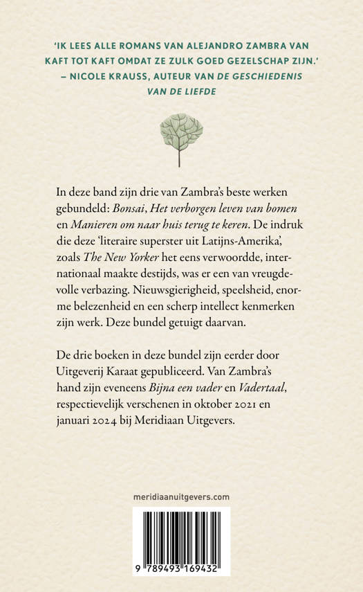 In deze band zijn drie van Zambra's beste werken gebundeld: 'Bonsai', 'Manieren om naar huis terug te keren', en 'Het verborgen leven van bomen'.