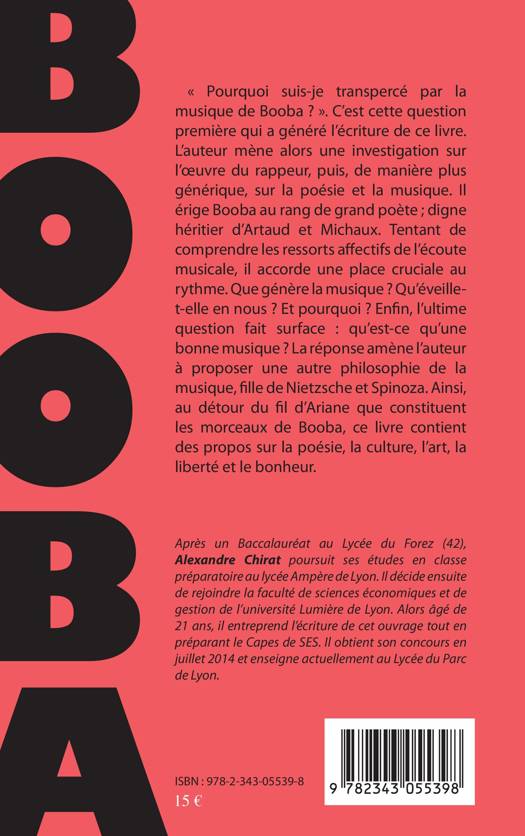 "Pourquoi suis-je transpercé par la musique de Booba ?" L'auteur mène ici une investigation sur l'oeuvre du rappeur, qu'il érige au rang de grand poète ; digne héritier d'Artaud et Michaux. De manière plus générique, il s'interroge sur la poésie et la musique afin de comprendre les ressorts affectifs de l'écoute musicale : que génère la musique ? Qu'éveille-t-elle en nous ? Pourquoi ? Et, enfin, qu'est-ce qu'une bonne musique ?