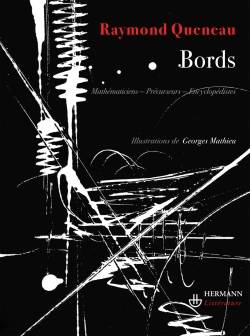 Illustrations de Georges Mathieu « Bords. Ce recueil d'essais, publié en 1963 par l'écrivain français Raymond Queneau (1963- 1976), est sous-titré : mathématiciens, précurseurs, encyclopédistes. Trois des textes sur des questions mathématiques y sont repris de l'édition originale (1950) de Bâtons, Chiffres et Lettres. La présentation de l'Encyclopédie de la Pléiade (originellement un « prospectus publicitaire » de 1956) est, ici, enfin éditée. Les autres textes sont reproduits de périodiques ou d'oeuvres collectives. De l'assemblage, il doit être dit qu'il s'impose. Il y entre de rares curiosités et analyses langagières et littéraires : Grainville, écrivain havrais, né en 1746, mort en 1805, auteur d'une étrange épopée anticipant les oeuvres d'anticipation, Le Dernier Homme ; Poe, comme annonciateur du roman policier ; des grammairiens d'Aquitaine qui, au XVIe siècle, font, si l'on veut, prévoir la Veillée de Finnegan de Joyce. Quant à l'essentiel, le livre se constitue dans deux ordres de matériaux intimement et vitalement fréquentés par cet auteur : les mathématiques et les encyclopédies. Ce qui est ici dit de la mathématique montre que Queneau n'a pas varié dans l'essentiel de ses choix, ni dans les orientations de son entreprise fondamentale. Dès Odile il est obsédé de mathématique, et jette la suspicion sur la dialectique (en même temps, il y refuse le principe de contradiction introduit par les surréalistes entre technique et inspiration en littérature). Or, en 1963 et dans ce livre : ... la mathématique supérieure ou non a subi pendant tout le cours du XIXe une évolution en tout point contraire au programme d'Engels : elle a éliminé toute apparence de dialectique. Queneau ne le dit pas pour river son clou à qui que ce soit, mais pour désigner des chemins indiscutablement dignes à ses yeux de notre fréquentation. Un article sur Charles Fourier (et à son propos sur Engels et Marx) lui donne occasion de citer, approximativement, celui qu'il commente, Fourier même : Notre premier fanal doit être la science éminemment juste, les mathématiques. Et dans la présentation de l'Encyclopédie de la Pléiade, Poincaré disait : Je ne comprends qu'on ne comprenne pas les mathématiques. En effet, puisqu'elles sont la structure même de l'esprit humain. Quant à l'Encyclopédie entreprise par Queneau, il l'a voulue (selon son très beau texte de présentation) : quant aux finalités à la fois enseignement, bilan, ouverture sur l'avenir ; quant aux utilisations à la fois comme livre de lecture continue, et comme ouvrage de référence . » LAFFONT-BOMPIANI, Dictionnaire desOEuvres contemporaines.