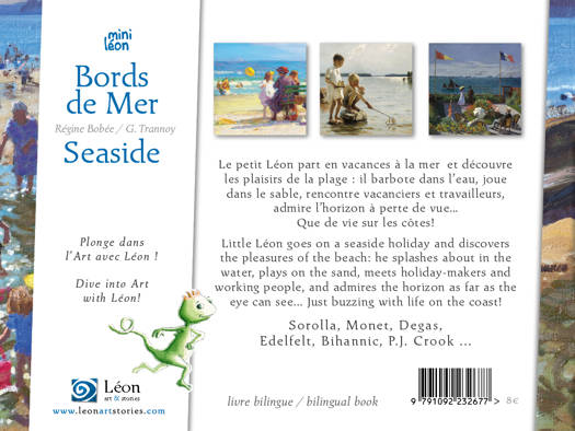 ⢠Le petit Léon part en vacances à la mer et découvre les plaisirs de la plage : il barbote dans l’eau, joue dans le sable, rencontre vacanciers et travailleurs, admire l’horizon à perte de vue... Que de vie sur les côtes !<br /> ⢠Sorolla, Monet, Degas, Ederfelt, Bihannic, P.J. Crook...<br /> ⢠Avec beaucoup d’humour, le petit caméléon Léon interagit avec treize oeuvres d’art<br /> d’époques et d’aires géographiques différentes. Chaque interaction est soulignée par une phrase en Français et en Anglais.