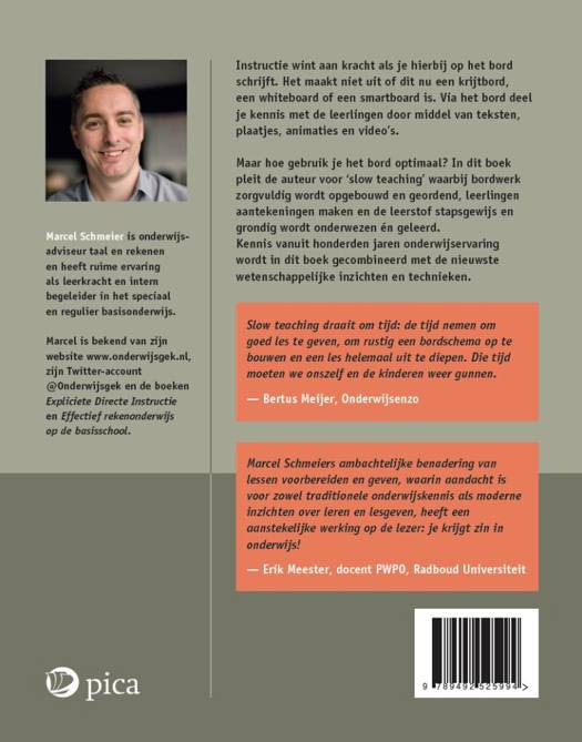 Maar hoe gebruik je het bord optimaal? In dit boek pleit de auteur voor ‘slow teaching’ waarbij bordwerk zorgvuldig wordt opgebouwd en geordend, leerlingen aantekeningen maken en de leerstof stapsgewijs en grondig wordt onderwezen én geleerd. Kennis vanuit honderden jaren onderwijservaring wordt in dit boek gecombineerd met de nieuwste wetenschappelijke inzichten en technieken.