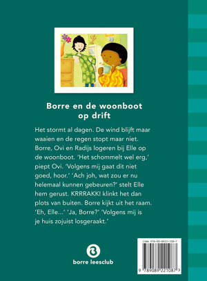 Vanaf 8 jaar. Elle, Borres goede vriendin, woont niet in een gewoon huis met een tuin, of in een appartement in een flat, maar in een woonboot. Lekker rustig op het water. Nou ja, lekker rustig... Net als Borre, Radijs en Ovi bij Elle logeren, breekt er een enorme storm los. De woonboot deint mee op de hoge golven en 'pats!' daar knappen de touwen! Woonboot op drift!