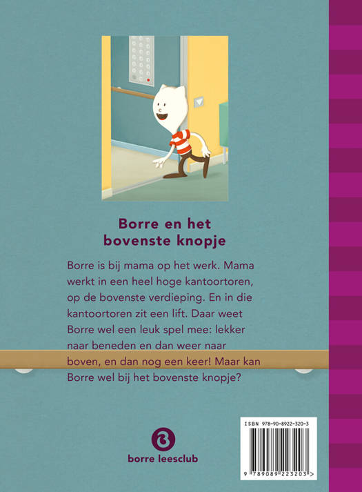 Vanaf 3 jaar - Borre is bij mama op het werk. Mama werkt in een heel hoge kantoortoren, op de bovenste verdieping. En in die kantoortoren zit een lift. Daar weet Borre wel een leuk spel mee: lekker naar beneden en dan weer naar boven, en dan nog een keer! Maar kan Borre wel bij het bovenste knopje?