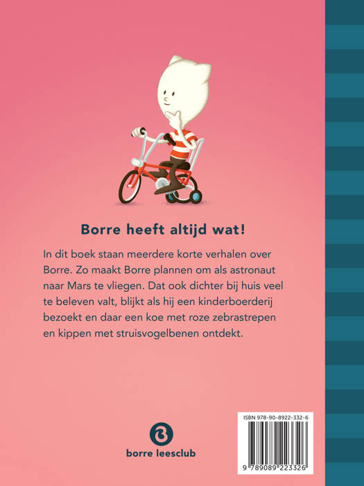 [Vanaf 3 jaar] In dit boek staan meerdere korte verhalen over Borre. Zo maakt Borre plannen om als astronaut naar Mars te vliegen. Dat ook dichter bij huis veel te beleven valt, blijkt als hij een kinderboerderij bezoekt en daar een koe met roze zebrastrepen en kippen met struisvogelbenen ontdekt.