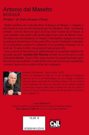 Quatre malfrats ont voulu dévaliser la banque de Bosque. L'équipée a mal tourné et tous ont été massacrés par les habitants. Muto, un homme solitaire, vient de découvrir que l'un d'eux était l'amant de sa femme. Il veut connaître cette petite ville perdue dans la province de Buenos Aires. Sur place, les circonstances, le hasard, l'atmosphère opaque et surtout la présence mystérieuse d'une jeune fille à moto l'amènent à enquêter en se présentant comme le scénariste d'un prochain tournage sur le hold-up. Et dans le film, tous joueront leur propre rôle. Avec sa prose d'une précision millimétrique et sa parfaite maîtrise du procédé narratif, Antonio Dal Masetto revient sur ce lieu qu'il a créé (Les Noces du fou, Seuil, 1984) pour montrer la cruauté humaine tapie derrière la respectabilité, l'ordre établi et les perversions qu'engendrent violence, hypocrisie sociale et désir de vengeance.