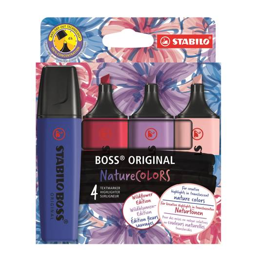 STABILO BOSS ORIGINAL NatureCOLORS Wildflower markeerstiften - 4-pack | STABILO De STABILO BOSS ORIGINAL NatureCOLORS Wildflower markeerstiften zijn perfect voor het markeren en structureren van teksten met frisse, moderne kleuren. Levendige Wildflower-kleuren voor creatief markeren