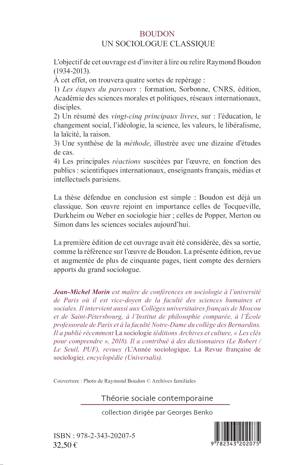 L'objectif de cet ouvrage est d'inviter à lire ou relire Raymond Boudon (1934-2013). Pour cela l'auteur propose quatre sortes de repérages: les étapes du parcours, un résumé des vingt-cinq principaux livres, une synthèse de la méthode employée (illustrée d'études de cas) et enfin les principales réactions suscitées par l'œuvre. Pour conclure l'auteur défend une thèse simple: Boudon est déjà un classique, dont l'œuvre rejoint celles de Tocqueville, Durkheim ou Weber en sociologie hier et celles de Popper, Merton ou Simon dans les sciences sociales aujourd'hui.