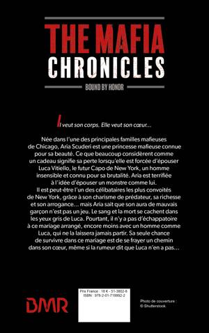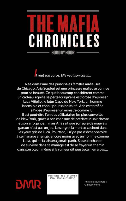 Il veut son corps. Elle veut son cœur… Née dans l’une des principales familles mafieuses de Chicago, Aria Scuderi est une princesse mafieuse connue pour sa beauté. Ce que beaucoup considèrent comme un cadeau signifie sa perte lorsqu’elle est forcée d’épouser Luca Vitiello, le futur Capo de New York, un homme insensible et connu pour sa brutalité. Aria est terrifiée à l’idée d’épouser un monstre comme lui. Il est peut-être l’un des célibataires les plus convoités de New York, grâce à son charisme de prédateur, sa richesse et son arrogance… mais Aria sait que son aura de mauvais garçon n’est pas un jeu. Le sang et la mort se cachent dans les yeux gris de Luca. Pourtant, il n’y a pas d’échappatoire à ce mariage arrangé, encore moins avec un homme comme Luca, qui ne la laissera jamais partir. Sa seule chance de survivre dans ce mariage est de se frayer un chemin dans son cœur, même si la rumeur dit que Luca n’en a pas…
