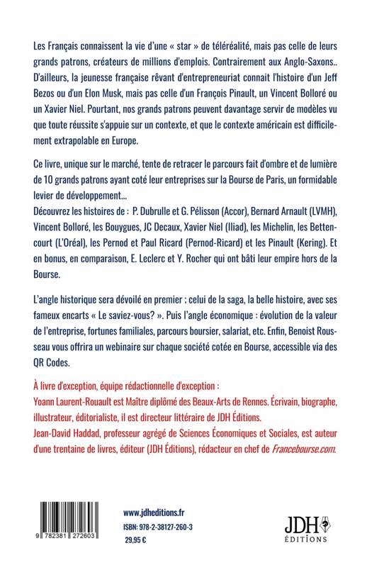 Le livre Les Français connaissent davantage la vie d'une star de téléréalité que celle de leurs grands patrons créateurs de millions d'emplois. À l'opposé, les Anglo-Saxons ne sont pas avares de livres sur leurs patrons. D'ailleurs, la jeunesse française qui rêve d'entrepreneuriat connaît l'histoire d'un Jeff Bezos ou d'un Elon Musk, mais pas celle d'un François Pinault, un Vincent Bolloré ou un Xavier Niel. Pourtant, nos grands patrons peuvent davantage servir de modèles, de sources d'inspiration pour les jeunes et les moins jeunes qui rêvent de réussir, vu que toute réussite s'appuie sur un contexte, et que le contexte américain est difficilement extrapolable en Europe. Mais les milliardaires français ne font pas l'unanimité. Ce livre vise à mieux les faire connaître, à réconcilier les Français avec ces gens au talent exceptionnel. Il tente de retracer honnêtement le parcours fait d'ombre et de lumière de 10 grands patrons ayant coté leur entreprise sur la Bourse de Paris, qui est un formidable levier de développement... Comment ont-ils démarré ? Avec quelle somme en poche ? Comment sont-ils devenus riches ? En combien de temps ont-ils bâti un empire ? Quelle est leur richesse aujourd'hui ? Quels compromis ont-ils dû faire ? Jusqu'où ? Que vaut leur entreprise en bourse ? Quelle croissance sur les 20 dernières années ? Est-ce un bon investissement boursier ? Un titre intéressant pour les traders ? Vous découvrirez donc l'histoire de Paul Dubrule et Gérard Pélisson (Accor), de Bernard Arnault (LVMH), de Vincent Bolloré, de la famille Bouygues, de Jean-Claude Decaux, de Xavier Niel (Iliad), et aussi celles de la famille Michelin, des familles Schueller et Bettencourt (L'Oréal), des familles Pernod et Ricard (Pernod-Ricard). Et en bonus, en comparaison, à la fin de l'ouvrage, les histoires d'Édouard Leclerc et d'Yves Rocher qui ont bâti leur empire totalement hors de la Bourse. Avec, là aussi, une analyse économique. Donc, en tout